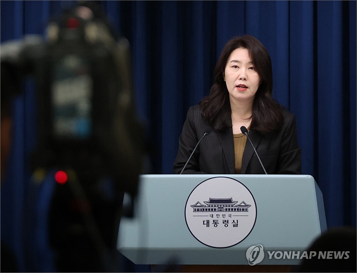 브리핑하는 강유정 대변인 (서울=연합뉴스) 한상균 기자 = 강유정 대변인이 28일 용산 대통령실 기자회견장에서 이재명 대통령의 초대 방송미디어통신위원회 위원장 인선 등 관련 브리핑을 하고 있다. 2025.11.28 xyz@yna.co.kr