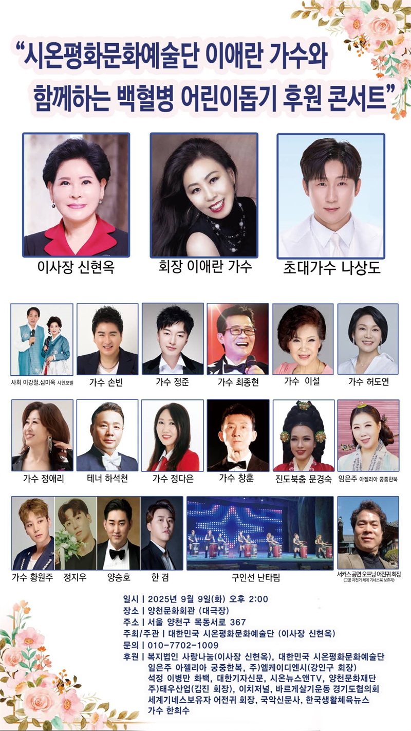시온평화문화예술단 이사장 신현옥 목사는 2025년 9월9일 오후 2시에 서울 양천문화회관 대극장에서 백혈병 어린이 돕기 후원 콘서트 개최한다. 이사장 신현옥 목사는 “백혈병 소아암 어린이들을 위한 순수한 후원 콘서트로 어린이들이 밝은 웃음을 되찾을 수 있도록 희생과 사랑으로 생명이 존중되는 복지사회 구현 실현에 뜻을 두