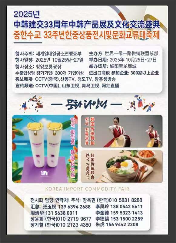 한중수교33주년 한중상품 전시및 문화교류 대축제 주체 세계일대일 공소연맹 총부행사일 ;2025년10월25일부터27일까지 중국 청양보룡광장 수출 입 상담기업: 300기업및 지자체 홍보매체 중국 :CC T V , 상도 T V.청도T V, 황흥생방송 홍보매체 한국 : 중 앙경제,A I 경제. 수도권뉴스 전시 총본장