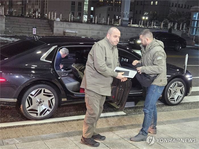 국방부 청사 도착한 우메로우 우크라 국방 (서울=연합뉴스) 김호준 기자 = 방한 중인 루스템 우메로우 우크라이나 국방부 장관이 27일 김용현 국방부 장관과의 회담을 위해 용산 국방부 청사에 도착했다. 2024.11.27 hojun@yna.co.kr