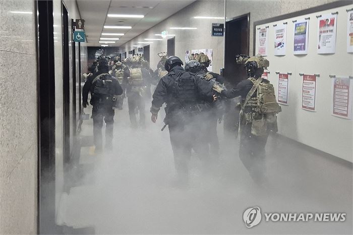 국회 본청 진입한 군 (서울=연합뉴스) 조다운 기자 = 4일 새벽 국회 본청에 진입한 군 병력이 본회의장으로 향하고 있다. 2024.12.4 allluck@yna.co.kr