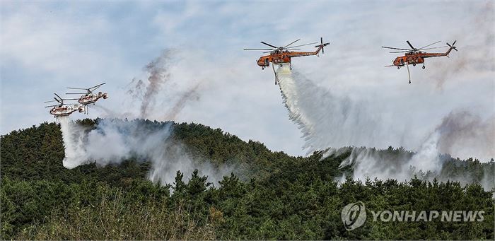 '산불 꼼짝마'…산불 진화 헬기의 위력 (대구=연합뉴스) 윤관식 기자 = 29일 오후 대구 달성군 오설리 일원에서 열린 2024년 산불 진화 합동훈련 및 재난대응 안전한국훈련에서 산림청 소속 헬기가 산불 진화 훈련을 하고 있다. 2024.10.29 psik@yna.co.kr
