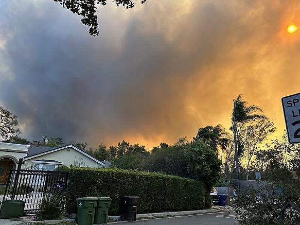 산불 위협을 받고 있는 LA 주택가 (로스앤젤레스=연합뉴스) 임미나 특파원 = 8일(현지시간) 연기로 뒤덮인 미 로스앤젤레스(LA) 카운티의 라카냐다 플린트리지 주택가. mina@yna.co.kr