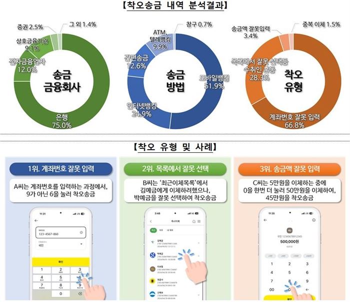 또한, 송금 정보 입력 과정에서 계좌번호를 잘못 입력(66.8%)하거나 '최근 이체 목록' 등에서 이체 대상을 잘못 선택(28.3%) 등에서 착오 송금이 주로 발생했다.
