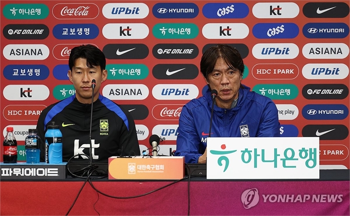 공식 기자회견 참석한 손흥민과 홍명보 감독 (서울=연합뉴스) 김성민 기자 = 대한민국 축구 국가대표팀 손흥민(왼쪽)과 홍명보 감독이 9일 서울월드컵경기장에서 열린 공식 기자회견에 참석해 있다. 2025.10.9 ksm7976@yna.co.kr