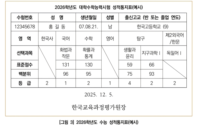 2026학년도 수능 성적통지표 예시 [한국교육과정평가원 제공. 재판매 및 DB 금지]