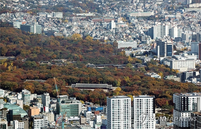 빌딩에 둘러싸인 종묘 (서울=연합뉴스) 이진욱 기자 = 국가유산청이 유네스코 세계유산인 종묘 인근 세운4구역 재개발 사업에 문제를 제기한 데 대해 이 일대 토지주들이 "국가유산청이 재개발을 불가능하게 한다면 부당한 행정 행위에 대한 책임을 물어 손해배상·직권남용 등 민형사상의 책임을 물을 것"이라며 반발했다. 사진은 11일 서울 종묘 모습. 2025.11.11 cityboy@yna.co.kr