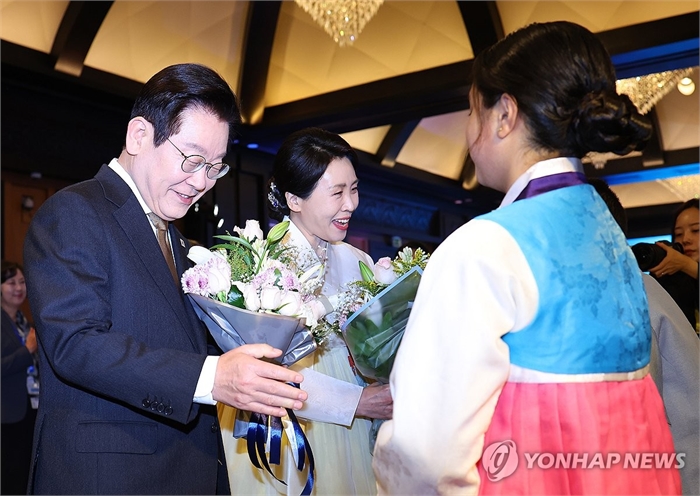 화동으로부터 꽃다발 받은 이재명 대통령 부부 (카이로=연합뉴스) 김도훈 기자 = 이집트를 공식 방문 중인 이재명 대통령과 김혜경 여사가 20일(현지시간) 카이로의 한 호텔에서 열린 이집트 동포·지상사간담회에서 화동으로부터 꽃다발을 받고 있다. 2025.11.21 superdoo82@yna.co.kr