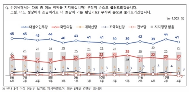 정당별 지지도를 보면 더불어민주당은 41%, 국민의힘은 20%를 각각 기록했다. 지난 조사와 비교해 민주당은 3%p 내렸고, 국민의힘은 같았다.
